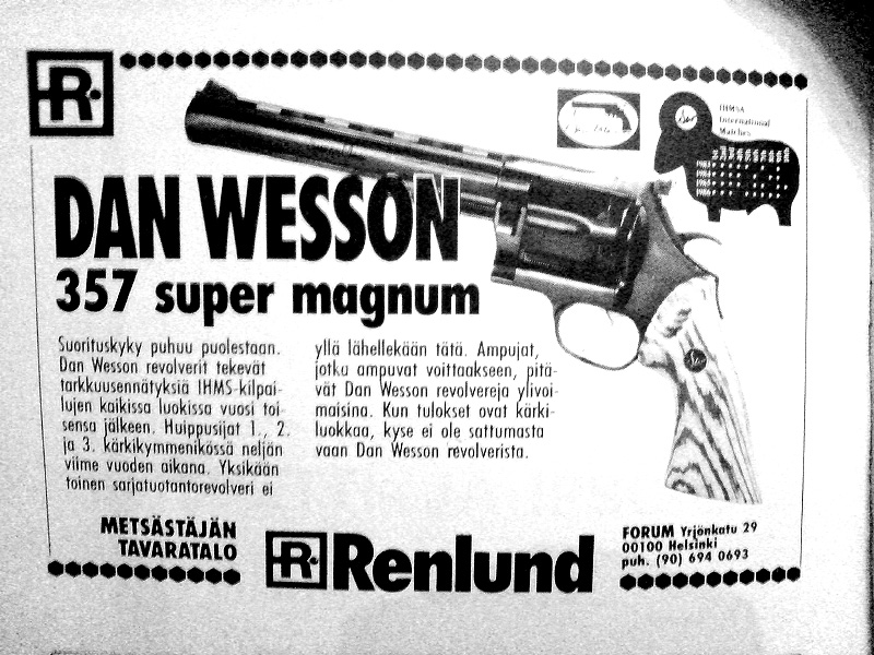 Can't come up with a particular ad, but do remember this comment from one of the gun magazine's from the late '70's or the early '80's. Some famous gun magazine writer had done an article about the Colt Python that had been sent to him. He was expounding about how great this Python was, accuracy and looks and what not. The last line in one of the paragraphs, he said, this gun is almost as accurate as my Dan Wesson. Since I was in the market for a .357 at the time, went to the local gun shop, and priced them both. Since the Python was double the price of the Colt at the time, around $200 for the DW, and almost $400 for the Colt, bought the DW. Never looked back. gypsyman